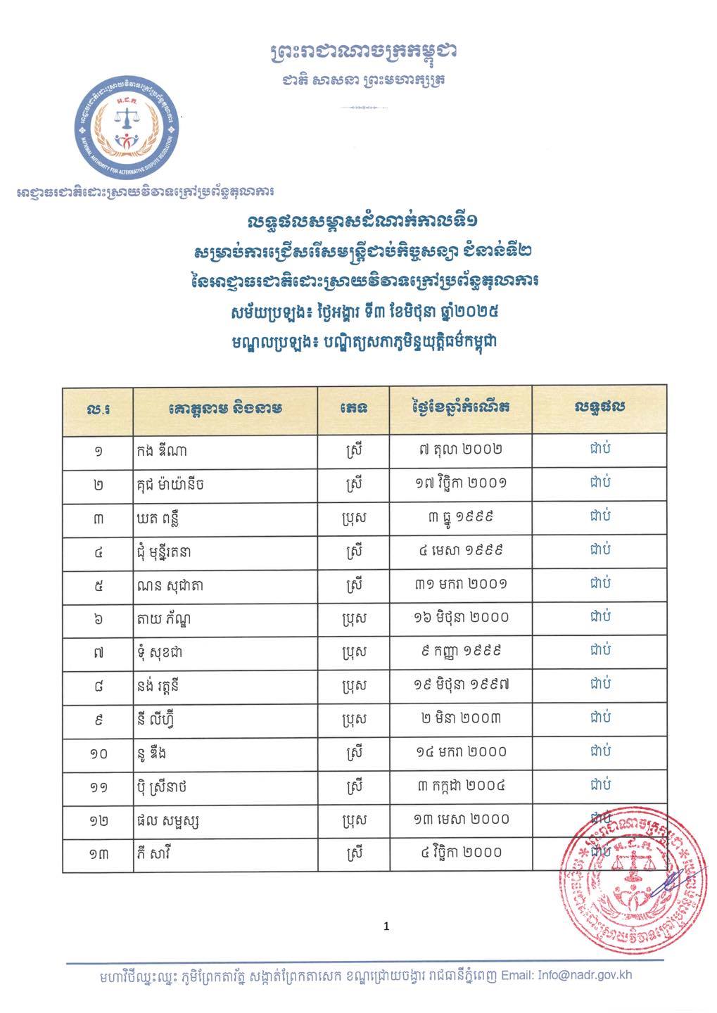 សេចក្តីជូនដំណឹងស្តីពីលទ្ធផលនៃការសម្ភាសជ្រើសរើសបេក្ខជន ដំណាក់កាលទី១ នៅក្នុងកិច្ចដំណើរការជ្រើសរើសមន្ត្រីជាប់កិច្ចសន្យា ជំនាន់ទី២ នៃអាជ្ញាធរជាតិដោះស្រាយវិវាទក្រៅប្រព័ន្ធតុលាការ